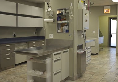 Previously home to a credit union, this location required significant “construction surgery” before it could come to life as a thriving animal hospital. It includes a surgical suite, examination rooms that consist of X-ray machines and other medical equipment, and a kennel.